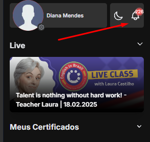Além disso, você recebe uma notificação sobre as lives na plataforma, que pode ser encontrada no ícone do sininho, próximo ao seu nome.