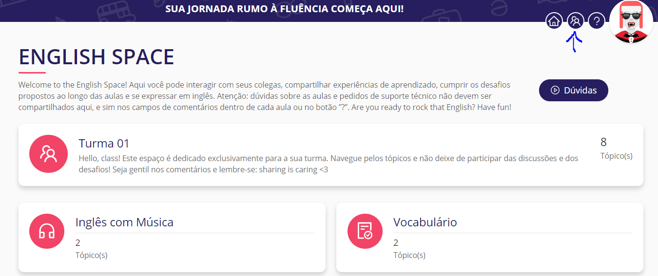 No English Space. Localizado à esquerda do seu avatar. Representado pelo ícone de duas pessoas.
